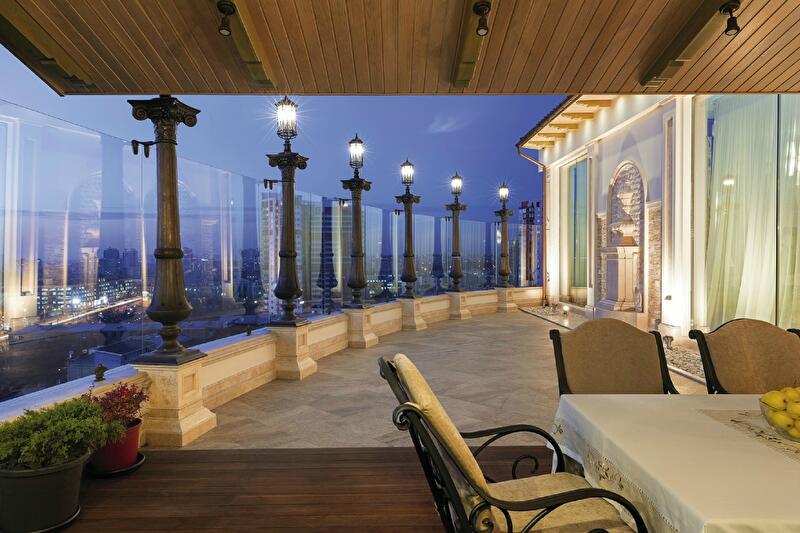 Вдохновившись театром Олимпико в Виченце, дизайнер Марина Пугачева создала его вольную интерпретацию на открытой террасе пентхауса, откуда открывается прекрасный вид на город. Чтобы сделать это место уютным, его обнесли высокой стеклянной балюстрадой – прозрачное ограждение защищает от ветра, но не закрывает пейзаж. В отделке использованы теплый травертин, яркая керамическая плитка ручной работы, дерево благородного оливкового оттенка (навес) и медь (колонны). Часть террасы перекрыта навесом и решена в духе уютного итальянского патио. Здесь расположены летняя кухня и большой гостеприимный стол.