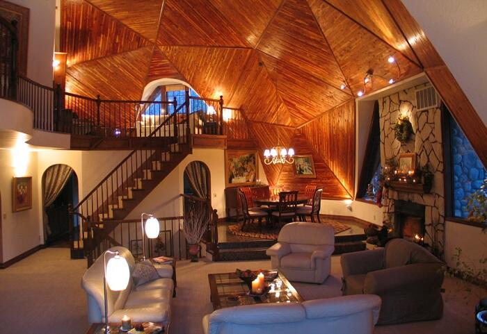Купольный дом с оригинальным дизайном. На первый взгляд может показаться, что купольные постройки однообразны. Однако возможности внутреннего дизайна домов подобного типа безграничны. Стенки и оконные проемы можно устанавливать в любом понравившемся месте.