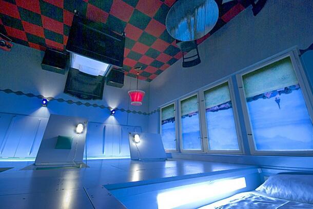 Еще один номер для любителей необычностей — «Вверх ногами» — полностью соответствует своему названию. Вся мебель в нем находится на потолке. Спать же можно в ящиках под полом, замаскированных под люки. Даже пейзаж в окнах номера вверх ногами — пока вы не откроете их.
