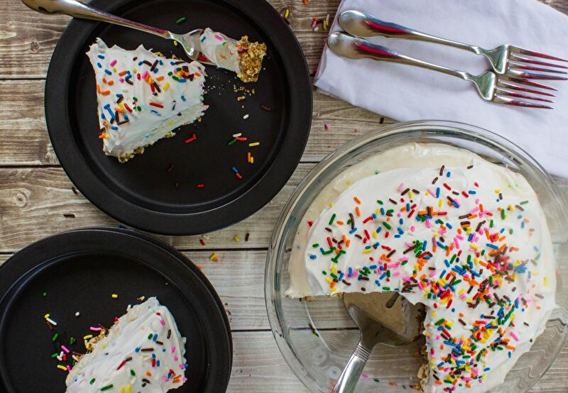 - Перед подачей покройте пирог оставшимися взбитыми сливками (250г) и украсьте цветной посыпкой.