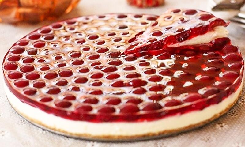 - Достаньте торт из холодильника, выложите оставшиеся вишни и залейте подготовленным фруктовым желе. Снова поставьте застывать в холодильник.