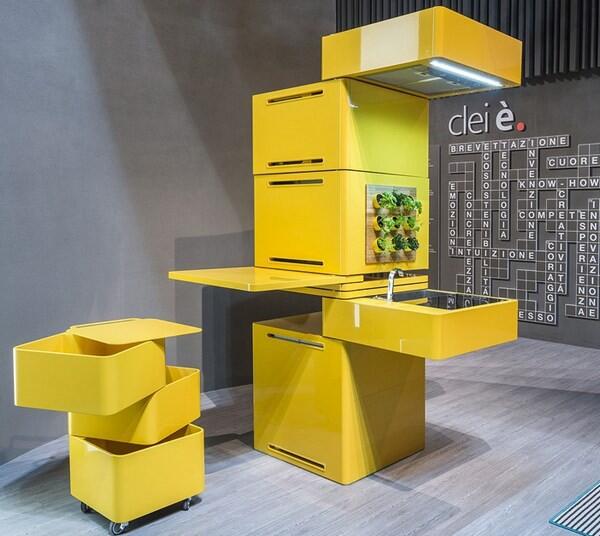 Не менее современно выглядит яркая модульная кухня марки Clei, компании, специализирующейся на трансформирующейся мебели. В колонну, состоящую из подвижных блоков, интегрированы мойка, вытяжка, рабочая поверхность и даже миниатюрный «вертикальный сад» с пряными травами.