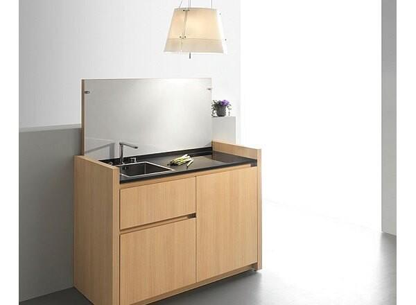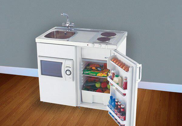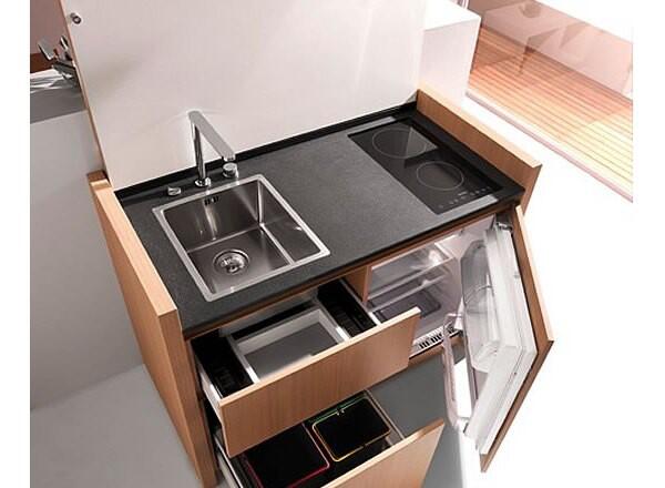 Кухню можно спрятать внутри маленького комода, причем так искусно, что никто из гостей не догадается, где находится зона приготовления пищи. Конечно, в таких условиях непросто состряпать обед из пяти блюд, но сделать пару бутербродов или разогреть ужин вполне реально.