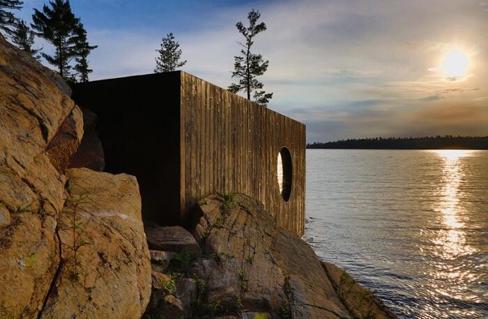 Сауна-грот. Эта сауна Grotto-Sauna расположена на берегу озера Гурон (Канада). Ее внешняя форма напоминает один из скалистых уступов, а внутренняя сделана в виде подземного грота, «отшлифованного» подземными потоками. Сквозь обтекаемые окна видны красоты озера и окружающего леса.