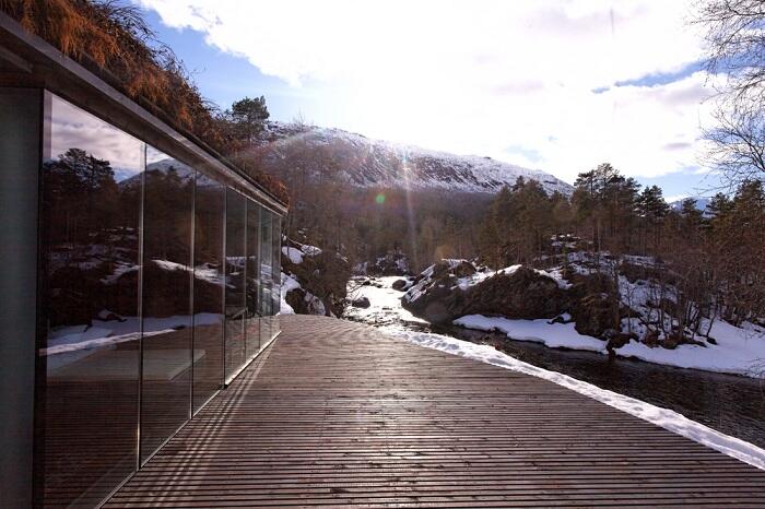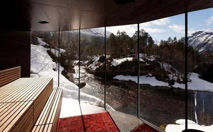 Сауна на берегу норвежской реки. Эта сауна, спроектированная архитекторами Jensen & Skodvin , расположена на популярном туристическом маршруте в Западной Норвегии. Ее окна выходят на красивейшую реку Валлдал.