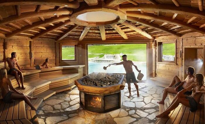 Сауна вместимостью 40 человек. Сауна в деревенском стиле расположена в отеле Bio-Hotel Stanglwirt у подножия горы Кайзер (Kaiser, Австрия). В ней могут поместиться до 40 человек.