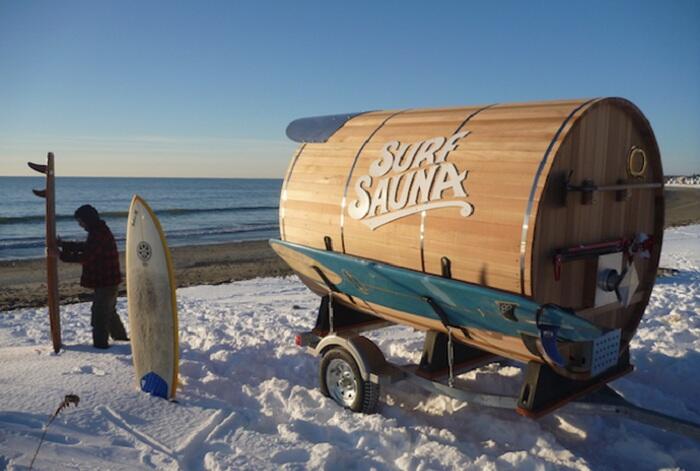 Surf Sauna - сауна вместимостью 8 человек. Группа отчаянных серферов спроектировала для себя передвижную сауну Surf Sauna , в которой они согреваются после экстремальных зимних заплывов. Внутри могут поместиться сразу 8 человек. Расслабиться в сауне можно не только на природе, но и в городе.