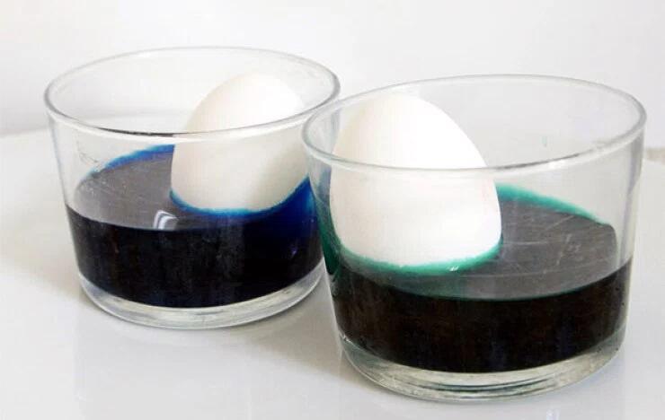 4. Яйца Миньоны. Опускаем «полюса» яиц поочередно в синий и желтый растворенный в воде пигмент и после высыхания клеим глазки.![]()