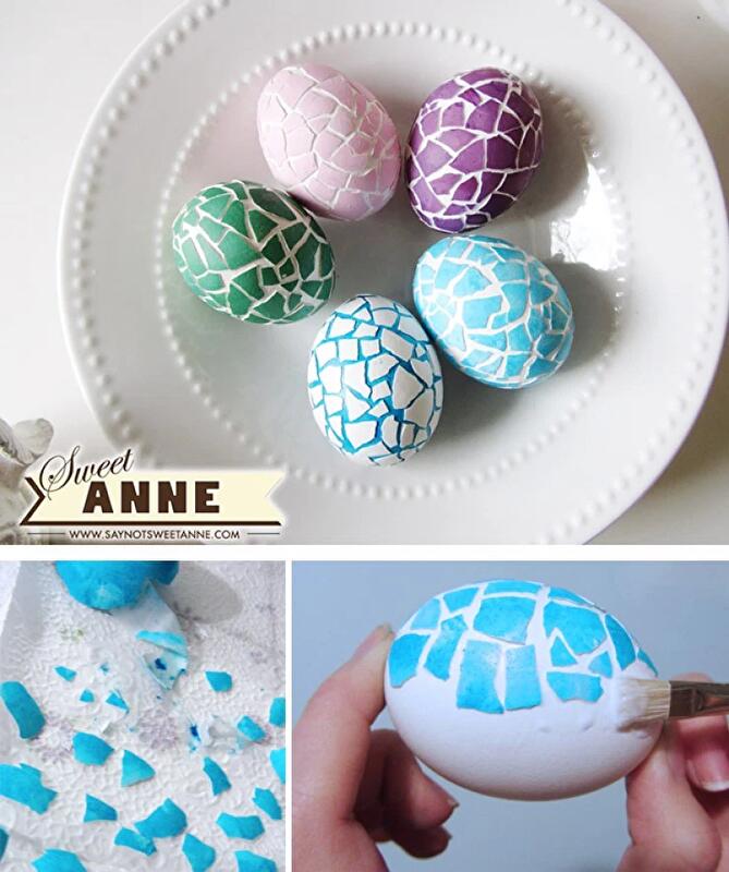 5. Мозаика. На неокрашенную поверхность сваренного яйца с помощью пищевого клея клеим «обломки» предварительно окрашенной скорлупы.