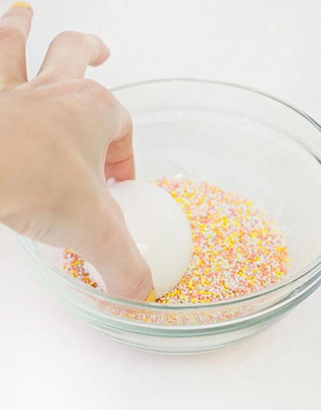 6. Солнечное яйцо. Покрываем яйца клеем и окунаем в декоративные конфеты.