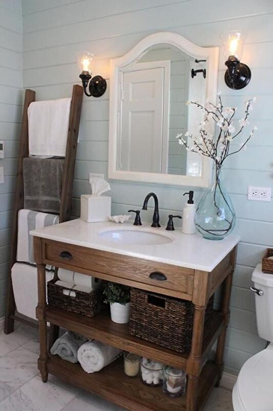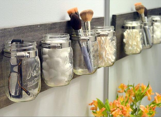 Глянцевый гарнитур с зеркалом и подсветкой замените на стеллаж (быть может, даже собственного изготовления). Или поставьте под раковину старый комод (обязательно обработайте дерево влагостойким составом!). Очень популярны самодельные «системы хранения» – например, из стеклянных банок.