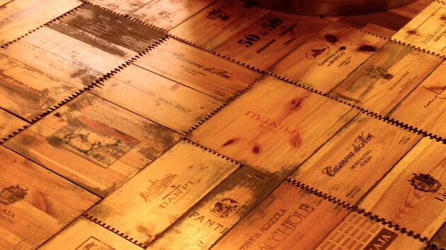 1. Это напольное покрытие идеально подойдет для винного погреба, библиотеки или рабочего кабинета. В нем вместо паркетных плашек использованы фрагменты винных ящиков с надписями и потертостями, свидетельствующими о том, что эта тара уже немало повидала. Подобный пол можно сделать даже собственными руками, правда, до этого потребуется не один год собирать винную коллекцию, причем не по бутылке, а целыми ящиками.