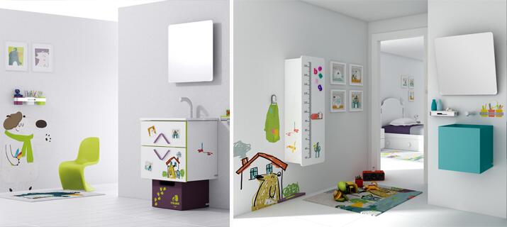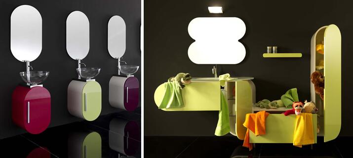Но «детский» характер мебели определяется не столько ее разноцветностью, сколько обтекаемыми формами и безопасностью в использовании. Именно это в полной мере демонстрирует коллекция мебели и сантехники для ванных Flux Us, предложенная итальянским производителем Lasa Idea. Цветовой спектр фасадов просто поражает воображение, но все предметы неизменно отличаются скругленными углами, чем существенно уменьшают риск получения травм у маленьких непосед.