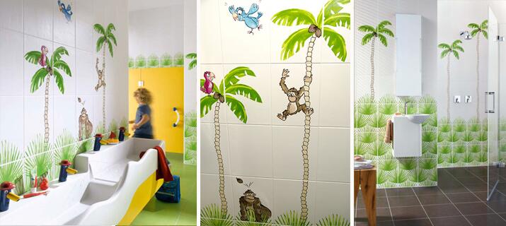 Коллекция керамической плитки Вongobongo от немецкого бренда Steuler будет вызовет интерес у самых маленьких домочадцев, превратив их ванную комнату в сказочные джунгли с пальмами и обезьянками. Но стоит убрать обезьянок, и бело-зеленый дизайн уже вполне можно назвать подростковым. Подобная универсальность – дополнительный плюс для подобных коллекций, позволяющий выбирать декор согласно возрасту и интересов ребенка.