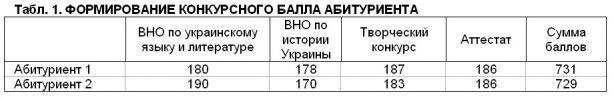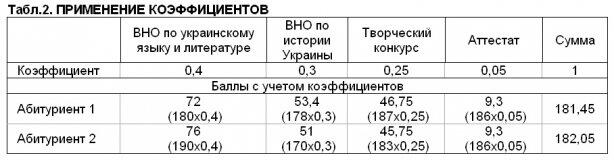 В таких условиях выше шанс поступить в учебное заведение у Абитуриента 1, поскольку его балл выше. Если же конкурсный балл будет рассчитываться с учетом коэффициентов, и вуз правилами приема предусмотрит, что самый высокий коэффициент будет присваиваться результату ВНО по украинскому языку и литературе (0,4) и истории Украины (0,3), то студентом станет Абитуриент 2, поскольку его конкурсный балл — 182,05 — выше, чем у Абитуриента 1 — 181,45. Для определения конкурсного балла мы умножили каждую его составляющую на соответствующий коэффициент, учитывая допустимый вес.