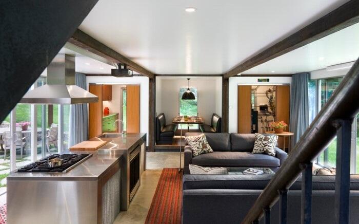 При входе внутрь дома, совершенно не понятно, из чего он на самом деле сделан. Железная гофра скрыта за листами гипсокартона, пол залит бетоном, балки и перекрытия из нержавеющей стали. Некоторые дверные проемы выполнены из красного дерева.