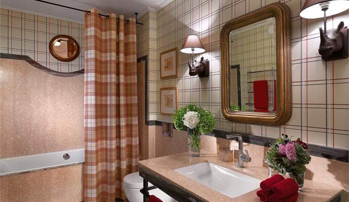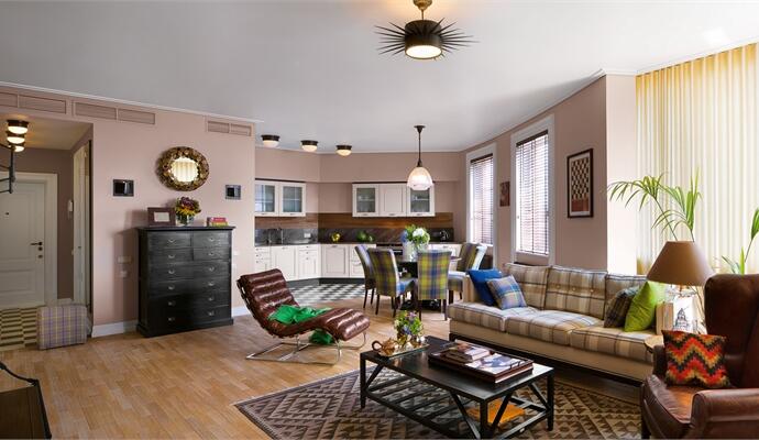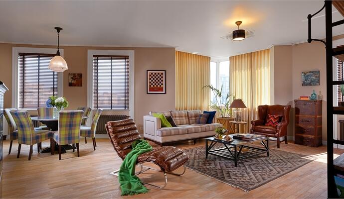 Заметный американский акцент придают интерьеру текстильные обивки мебели и покраска стен: повторяясь, перекликаясь и дополняя друг друга, вариации рисунка «клетка» становятся лейтмотивом декораторского решения, привнося уютное настроение в духе home sweet home. Американскую тему, но в несколько ином направлении развивают деревянные жалюзи — тут внимательный зритель найдет явные аллюзии на сумрачно-роскошные интерьеры из «Крестного отца». Подобных «американизмов» немало: это и характерная небоязнь цвета, и свободные укрупненные пропорции (общей площади, отдельных комнат, мебели), и такие маленькие, но яркие детали, как, например, часы-таблетка в стиле демократичных закусочных при мотелях.