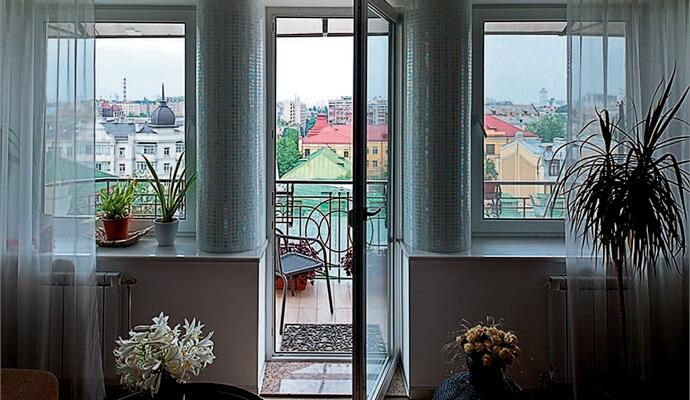 Многие декоративные средства позаимствованы авторами из классических интерьеров. К примеру, задействована лепка, и если на стене в гостиной скульптор выполнил легкий флористический росчерк, то в коридоре появился целый «виноградник», обрамляющий дверь с изображением «ватиканской шишки». Активно используется и роспись: шкаф в спальне снабжен копиями рисунков из Лоджий Рафаэля в Ватикане. Только что нагрянувшим гостям на всякий случай напоминают о профессии хозяев: в коридоре под потолком изображен «герб Архитектора», ничуть не уступающий масонским по многозначности. Большинство предметов мебели в квартире выполнено по личным чертежам авторов. Особенно любопытны «квадраты» в гостиной: максимально подчеркнута текстура отделанных шпоном фасадов, боковые части выкрашены в белый цвет. Это, с одной стороны, делает конструкции визуально невесомыми, а с другой — практически сращивает их со стеной. Кстати, каплевидные ножки — элемент исключительно декоративный: шкафы являются подвесными. Использованные материалы приятно удивляют честной натуральностью: люстры выполнены из муранского стекла, полы покрыты финской паркетной доской из ясеня и брашированного дуба. Столешница туалетного столика в спальне сделана из травертина, а в санузле — из древовидного оникса. Все вместе представляет собой смешение классического и современного стилей. Собственно, как и архитектурный ансамбль за окнами.