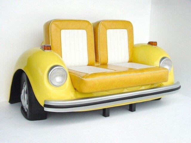 Для любителів блискучого, можливо виготовити таке крісло навіть на хромованих дисках. Купити такий елемент меблів можна в середньому за 3000-3500 $. У продовженні теми, хочемо продемонструвати диван, імітує заднє сидіння автомобіля Volswagen Жук. Зручні і м'які сидіння з різними аксесуарами, такими як колеса, бампер і фари, мигалками. Присісти на такому дивані завжди буде зручно і комфортно.