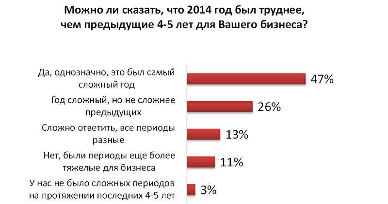Почти половина работодателей назвала 2014 год самым сложным за последние 4-5 лет. Каждый второй считает уходящий год таким же, как и предыдущие, а десятая часть – проще, чем предыдущие. И только 3% компаний не заметили кризисных явлений.