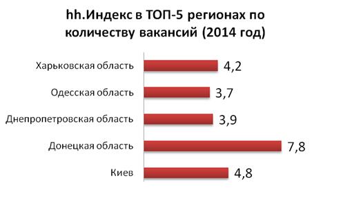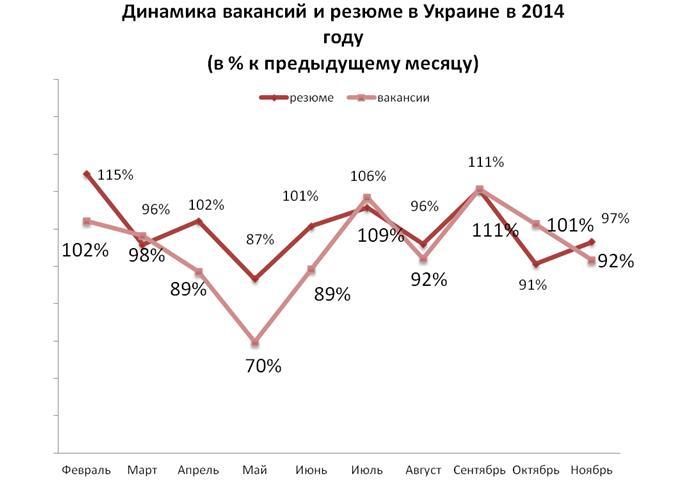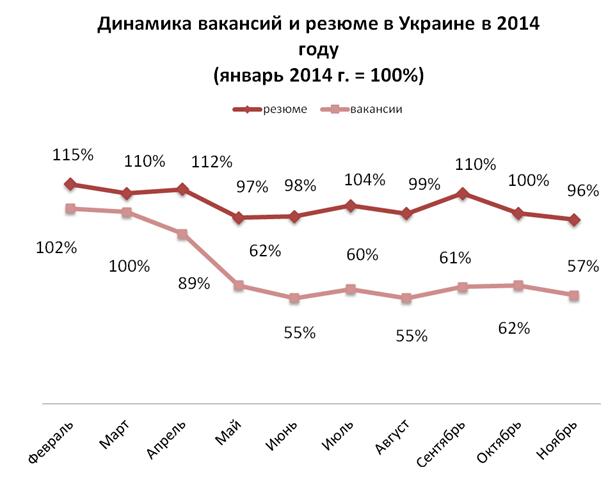 К концу года наименее заметным было сокращение количества вакансий в Житомирской, Закарпатской, Ровенской и Киевской областях, здесь количество предложений уменьшилось всего лишь на четверть по сравнению с началом года. Также в ноябре по сравнению с январем 2014 во всех городах из ТОП-5 (кроме Донецка) количество вакансий сократилось на 40%.