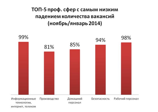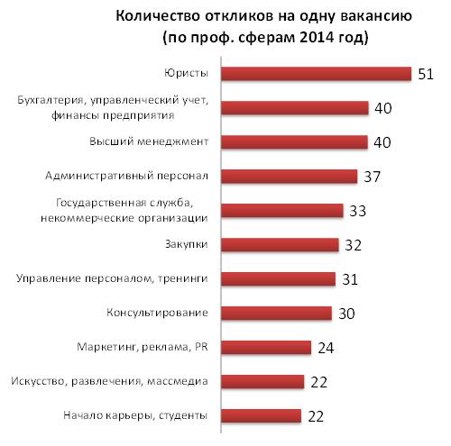 — Конкуренция за 2014 год выросла в 2 раза и к декабрю составила 5 соискателей на одно рабочее место. Самая высокая конкуренция наблюдалась среди юристов, финансистов, руководителей, молодых специалистов и работников некоммерческих организаций. Самая низкая конкуренция — среди работников страховой сферы, программистов и системных администраторов, медицинских представителей и фармацевтов, рабочего персонала и специалистов по продажам.