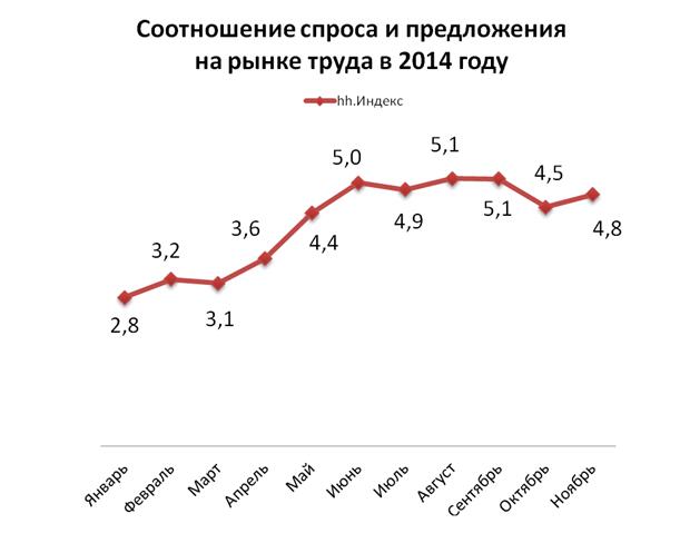 В связи со снижением количества вакансий в 2014 году закономерно вырос и показатель конкуренции — hh.Индекс (отношение количества резюме к количеству вакансий). В этом году он составлял 4,2 – это означает, что на одну вакансию претендовало больше 4-х соискателей (заметим, что в 2013 этот показатель был 2,6, а в 2012 — 2,2).