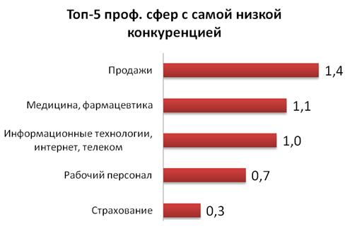 Как и в случае с самой высокой конкуренцией, так и в случае самой низкой, ТОП-5 практически полностью совпадают с лидерами 2013 и 2012 годов (исключение — только сфера «НКО»).