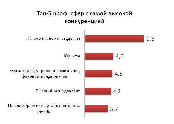 Уровень конкуренции в этой проф. сфере — один из самых высоких: 4 специалиста на одно рабочее место, а в некоторых специализациях (юристы, финансисты, управление персоналом) конкуренция может составлять 10-15 человек на одно рабочее место.