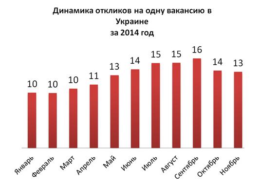 В месяц на вакансии на hh.ua откликается в среднем 139 тыс. соискателей. Заметим, что даже несмотря на кризисные явления, абсолютные показатели активности соискателей такие же, как и в 2013 году (в среднем отзывались 128 тыс. соискателей), однако в связи с уменьшением количества предложений выросло и количество откликов на одну вакансию. Так, в 2013 году на одну вакансию в среднем отзывалось 7 человек, а в 2014 – 12.