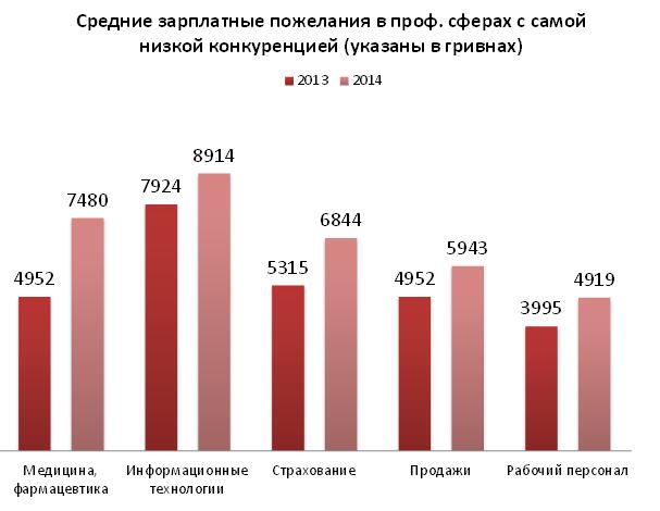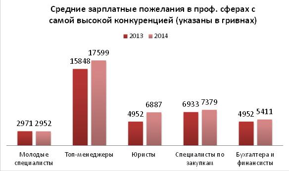 В целом же зарплатные пожелания соискателей в 2014 году находились на уровне 5-6 тыс. грн. Этот показатель на 15-20% выше средних зарплатных предложений (такая ситуация является нормой на рынке труда).