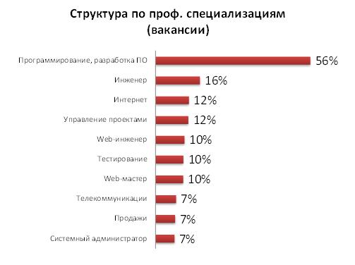 Большинство вакансий предлагают программистам и разработчикам, наиболее востребованы Java, .net, PHP, Python, C++ разработчики среднего и начального уровня и QA-специалисты.