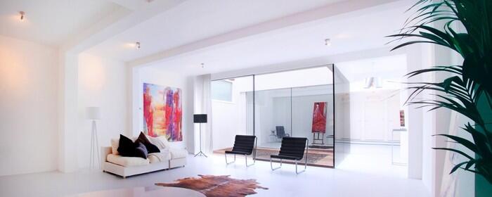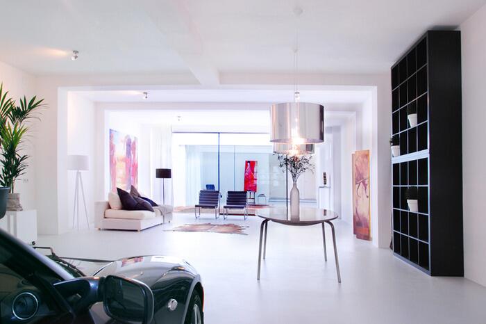 Электрический спортивный автомобиль имеет свое парковочное место в этой глянцево-белой гостиной в голландском городе Арнем.