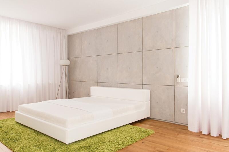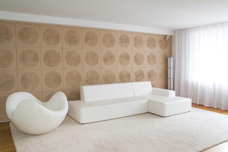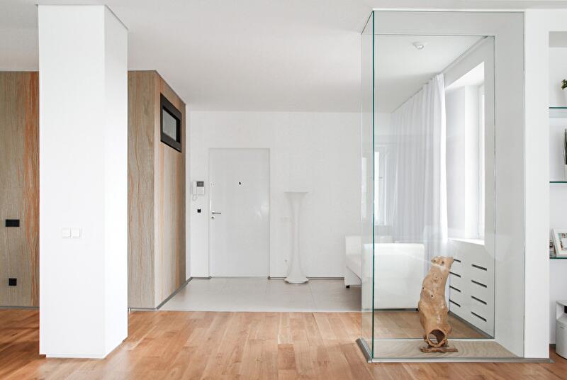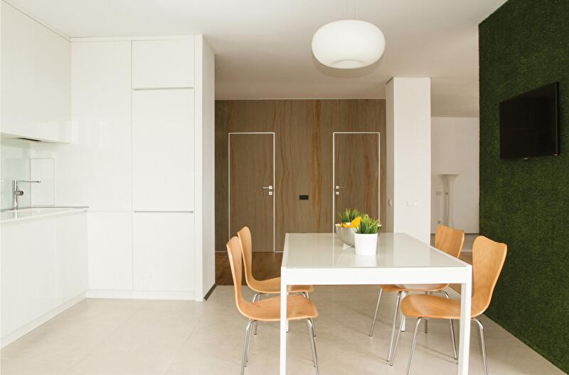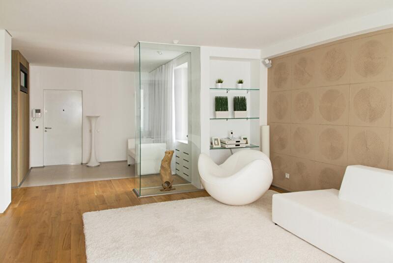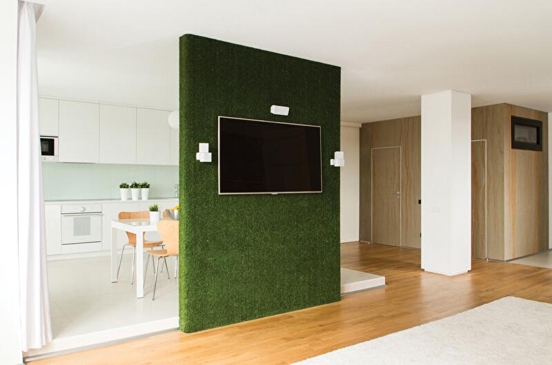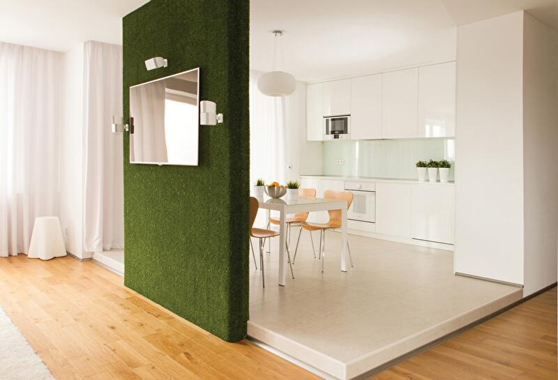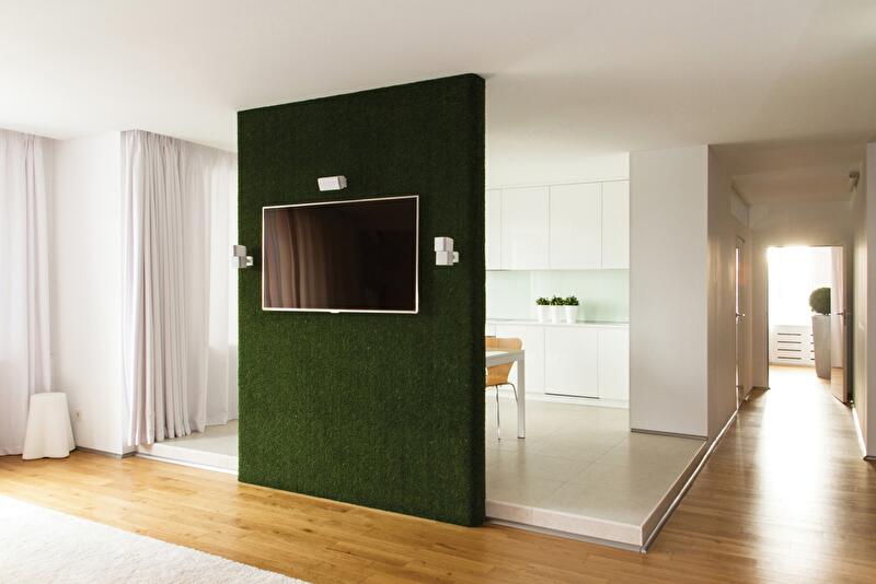 Интерьер оформлен с учетом потребностей и пожеланий двадцатилетнего студента, которому и принадлежит жилье. В силу своего возраста, заказчик оказался авантюристом, поэтому с первых минут доверился профессионалу и одобрил первый же эскиз, который дизайнер ему показал. Изюминкой проекта стала фитостена, которая зонирует кухню и гостиную. Она состоит из металлического каркаса обшитого гипсокартоном, сверху которого находится рулонное покрытие, имитирующее настоящую траву. Внутри конструкции спрятаны провода телевизоров, которые крепятся по обе стороны фитостены. Кроме того, яркий зеленый цвет разбавляет белый интерьер и является акцентом этого пространства. Полы в кухне подняли на 120 миллиметров, чтобы обозначить территорию приема и приготовления пищи. Справа от входной двери находится камин, его высота обусловлена соображениями безопасности. Панно за диваном - это ручная работа художника, с использованием 3D-покрытия, которое имитирует узоры на песке. В спальне за изголовьем кровати находятся панели из ГКЛ, которые напоминают бетон.
