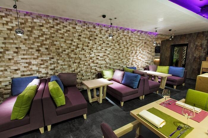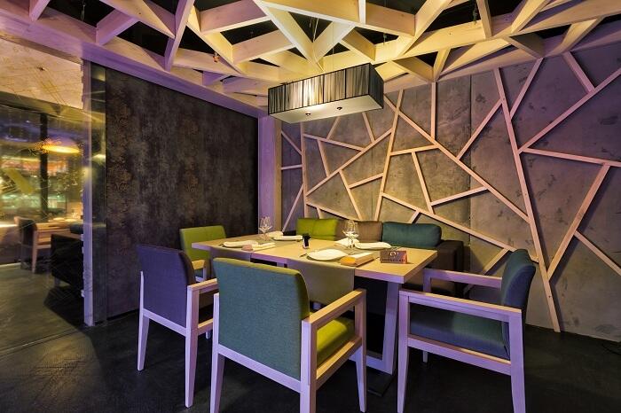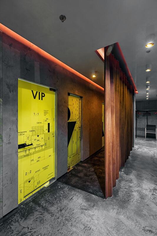 Пространство самого ресторана разделено на 4 зоны. Общий зал с баром, кальянная-караоке, вип-зал, и детская комната. Все залы органично дополняют друг-друга не только по функции но и по стилистике. Холодные элементы лофта сглаживают поверхности из натурального дерева из ясеня с активной текстурой, озеленение, цветной текстиль, и теплое освещение.