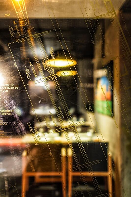 Стеклянные перегородки, Что бы обезопасить стеклянные конструкции на них были нанесены принты рабочей документации ресторана.