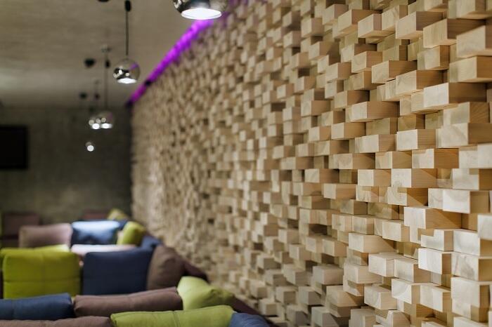 Сложный ячеистый деревянный потолок скрывающий инженерию. Стена в кальянной выполнена из деревянных кубиков разных размеров, также эта стена несет функцию звуковых ловушек караоке. Барная стойка и барный стеллаж.