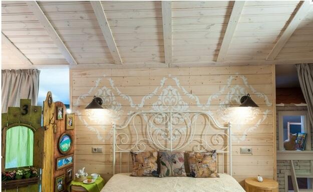 Для кровати было выбрано покрывало с дамасским узором, правда, узор этот гораздо лучше видно на перегородке за изголовьем. Мы нанесли его на доски акриловой краской по трафарету. Из ткани с таким же узором сделаны римские шторы. Кроме того, ею затянуто пространство между полками с двух сторон от камина.