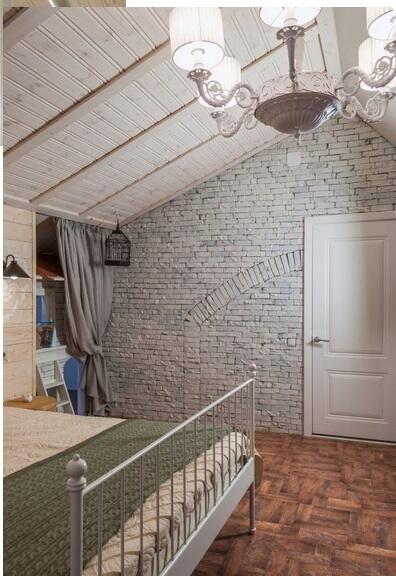На одном из мансардных скосов разместили слуховое фальшокно, под окном установили декоративный камин. И окно, и камин отделали молдингами и розетками с имитацией гипсовой лепнины. Все полиуретановые элементы состарены – покрыты темной патиной вручную.