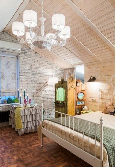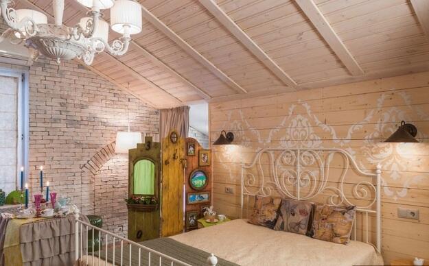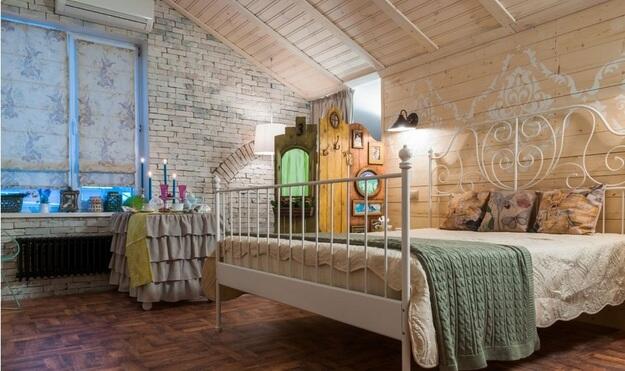 Обстановка в этой спальне – одновременно креативная, забавная и трогательная. Например, вместо прикроватных тумб мы использовали высокие бамбуковые корзины. Оставили в интерьере хозяйскую кровать с металлическими спинками и вензелями в изголовье – она идеально вписалась в концепцию.