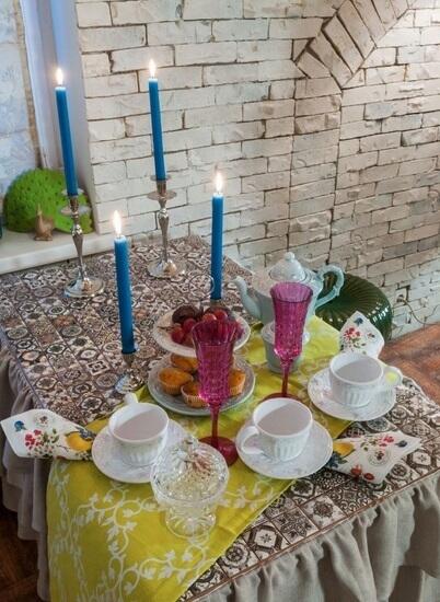 Яркие свечи на столике, лимонно-желтые салфетки, бокалы цвета фуксии напоминают: мы только играем в классику и кантри. Многоцветный и немного хулиганский декор расслабляет и успокаивает не хуже, чем вязаный плед поверх покрывала на кровати и льняные портьеры у входа в детскую.