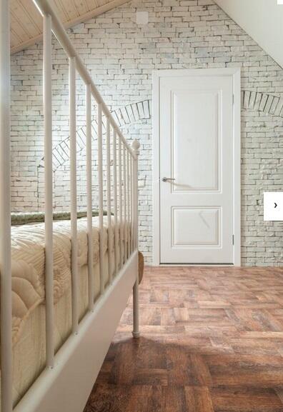 Второй скос закрыт деревянными обоями – мы покрасили их в белый цвет. На полу – пробковое покрытие «под паркет».