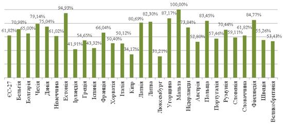 Частка біомаси серед відновлювальних джерел енергії у кінцевому енергоспоживанні ЄС , 2011 рік
