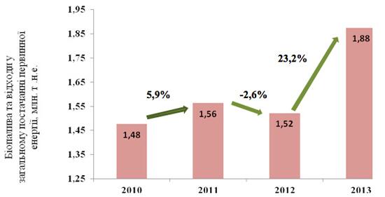 Порівняно з 2012 роком спостерігається помітний ріст внеску біомаси до загального постачання первинної енергії - на 23%.