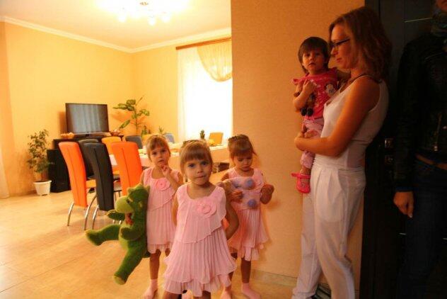 На этот раз дом в Донецке подарили семье Рудых. У Елены и Евгения Рудых есть двое собственных детей — правда они уже совсем взрослые. Дочери — 19, она учиться в университете, сыну — 22, он уже работает, живет с родителями, помогает им. Два года назад Рудые забрали из интерната трех маленьких девочек — тройняшек Веру, Надежду и Любовь. У одной из сестер — детский церебральный паралич. А на этой неделе в многодетной семье появились еще трое детей — Влад, Лера и Аня.