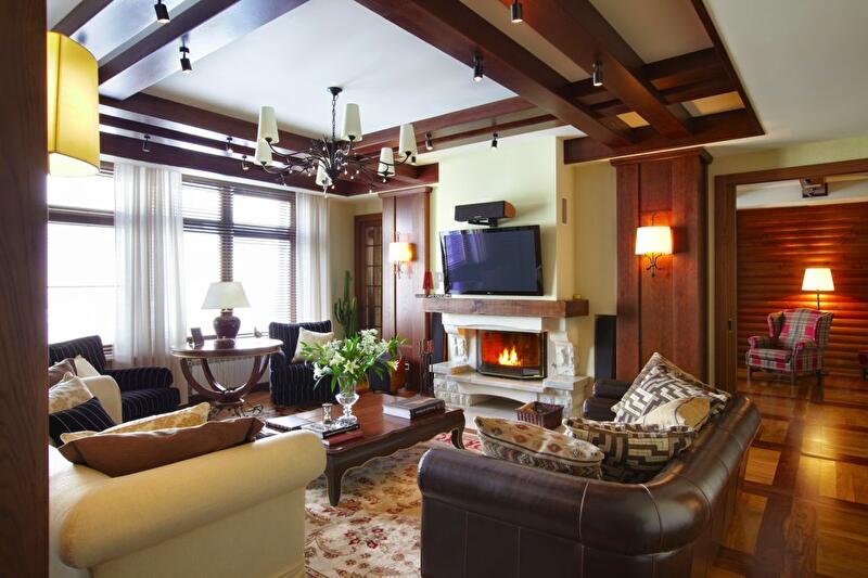 В результате отделки блок-хаусом, интерьер может сочетать в себе на фоне деревянного сруба – элементы классики, кантри, хай-тека и других стилей и направлений. Отделка деревом может быть использована в различных помещениях, как жилых так и вспомогательных — гостиных, кухнях, детских, игровых, холлах, саунах и банях.