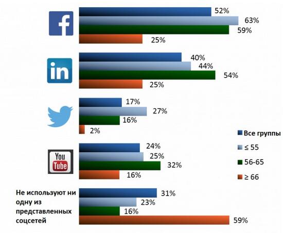 Согласно исследованию, возраст инвесторов также влияет на их выбор: 59% инвесторов, возраст которых превышает 65 лет, не пользуются социальными медиа, в то время как среди инвесторов моложе 56 лет лишь 23% игнорируют социальные сети. Как ни парадоксально, но среди инвесторов, чей возраст находится в рамках 55 – 65 лет, только 16% не зарегистрированы в соцсетях.