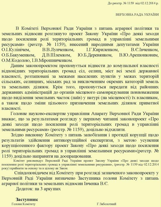 Один із співавторів законопроекту Юрій Дерев'янко каже, що антикорупційний комітет дав позитивні висновки щодо такого ж законопроекту - №1252 - про передавання державних земель у розпорядження місцевим радам. "Порівняльні таблиці законопроектів свідчить, що ці закони однакові", - пояснив він.