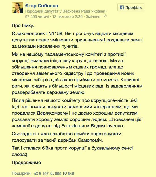 Причина ж бійки - персональна. Наприкінці року комітет з питань протидії і запобігання корупції, який очолює Соболєв, зробив негативний висновок щодо цього документа. Перед цим він без перешкод був ухвалений аграрним комітетом.