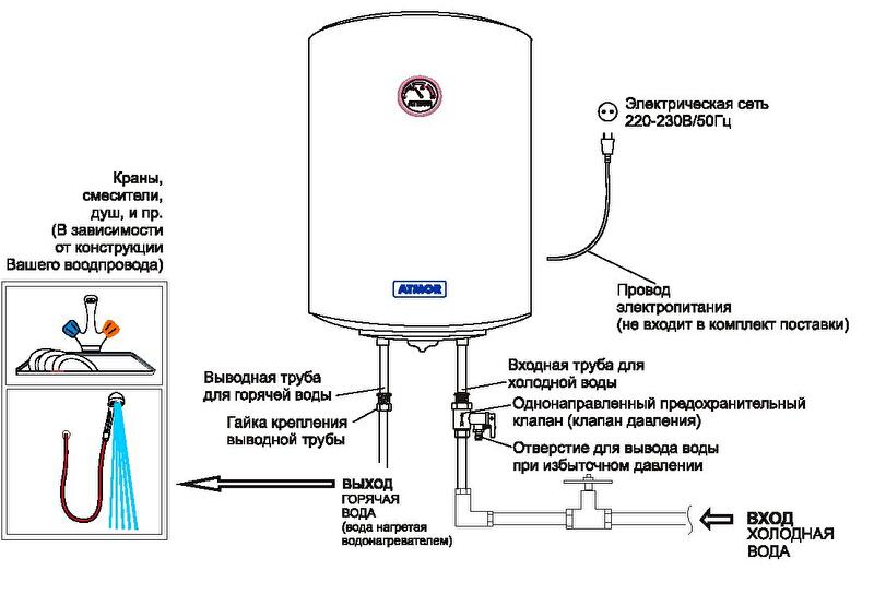Электрический накопительный водонагреватель нагревает воду до нужной температуры, после чего автоматически поддерживает её на установленном уровне. Забор холодной воды в бойлер происходит под давлением и под таким же напором выдается горячая вода.